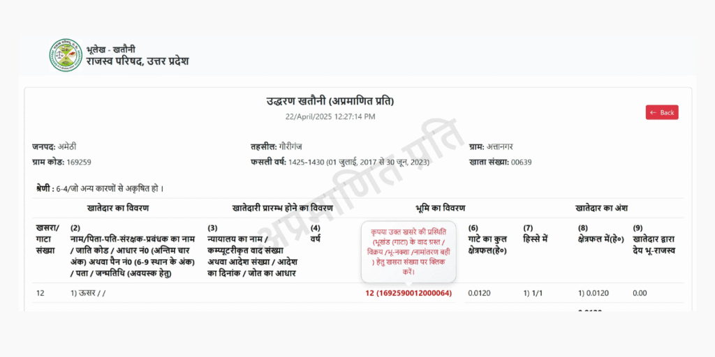 अब आपके सामने उद्धरण खतौनी (अप्रमाणित प्रति) प्रदर्शित हो जाएगी, जिसे आप चाहें तो प्रिंट निकालकर सुरक्षित रख सकते हैं।